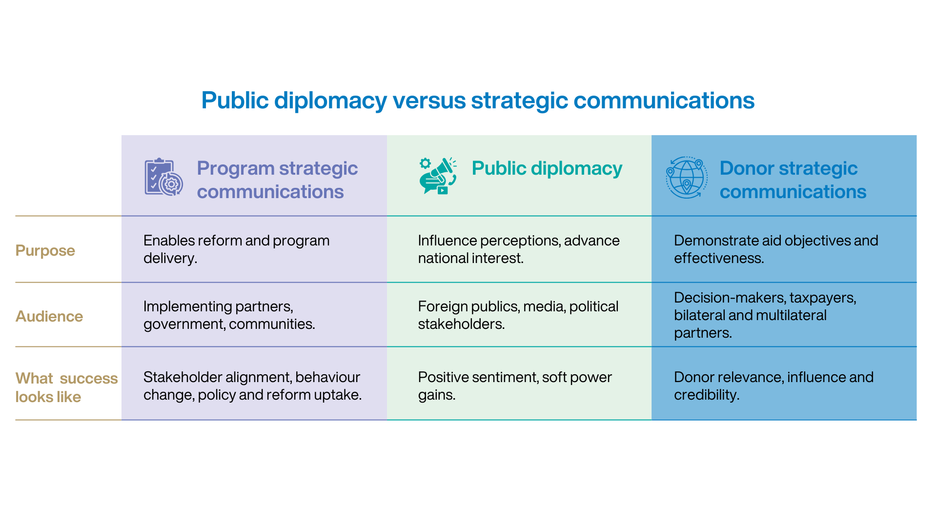 Public diplomacy adds another layer. Donors use it to engage foreign and domestic publics, build goodwill and strengthen relationships. In the development space, this usually takes the form of launches, branded events, media coverage and visibility. It is important that programs contribute to their donor’s public diplomacy efforts, but it should be balanced with program communications needed to drive reform, facilitate behaviour change, engage and/or support partners.